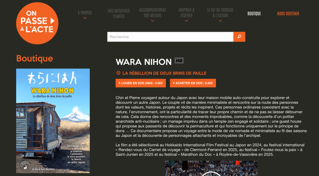 Après de longs mois passés sur les routes du monde lors de projections citoyennes originales et surprenantes, le film « Wara Nihon » s’installe sur le site de l’association « On passe à l’acte ». Le film est disponible à la vente et à la location chez le producteur et distributeur de films documentaires inspirants. Pierre Westelynck ajoute son nom pour la deuxième fois à la liste des réalisateurs de films en vente chez « OPA » après la sortie en salles et en DVD de son premier film « Artistes de la vie » en 2019.